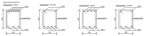 The building has four lateral-load resisting frames along the transversal X direction, with constant beam cross-section 300 mm × 400 mm. Along the longitudinal Y direction, there are only two external frames where the columns are connected through a flat beam with cross section 300 mm × 240 mm. All the columns have the same cross-section, 300 mm × 300 mm. The reinforcement layouts of the typical cross-sections of the frame elements are shown in Figure 4 and Figure 5. It is worth remarking that all RC elements are designed without any seismic detail.