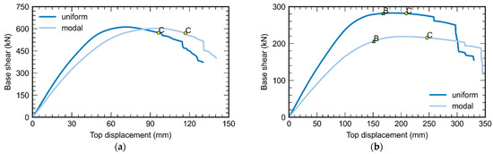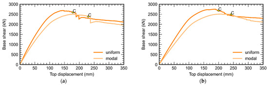 The results in terms of base shear vs. top displacement curves are reported for X (strong) direction in Figure 12a and for Y (weak) direction in Figure 12b, for both the lateral forces distribution, i.e., uniform and modal. Due to the effect of the reinforcing RC-skin frame, the capacity in terms of base shear is significantly higher than the capacity of the existing building and the values for actions in X and Y directions are now comparable, leading to a structure without a weak direction. Actually, the capacity is slightly higher in the Y direction respect to that in the X direction, since there are more reinforcing columns along the sides parallel to Y direction. Moreover, it is possible to observe that, in both directions and for both pushover analyses (uniform and modal force distributions), the LS chord rotation capacity of the first column of the existing building is achieved just after the beginning of the softening branch.