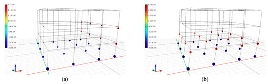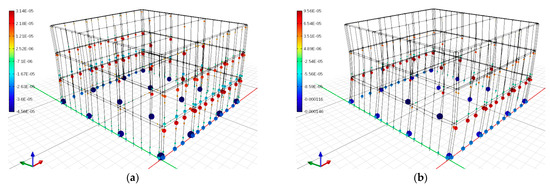 The failure mechanisms can be inferred by observing the evolution of the curvatures of the sections at the column and beam extremities during the analyses, reported in Figure 7 and Figure 8 for loading in X and Y direction, respectively. Actually, in the X (strong) direction the first hinges occur at the base of the columns, with some hinges also at the top sections of the columns in the first and second floor, as shown in Figure 7a. Then, a soft-story mechanisms is clearly evidenced with plastic hinges in all of the columns of the ground floor at both base and top sections when the ultimate chord rotation capacity is attained, as depicted in Figure 7b.
