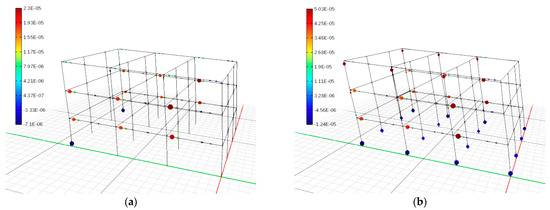 RC existing building, uniform pushover. Curvature distribution corresponding to a top displacement in X direction of: (a) 50 mm; (b) 95 mm (attainment of the LS chord rotation capacity). Red line X direction, green line Y direction.