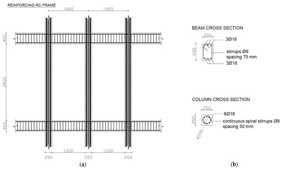 RC-framed skin: (a) reinforcement layout; (b) beam and column cross-sections.
