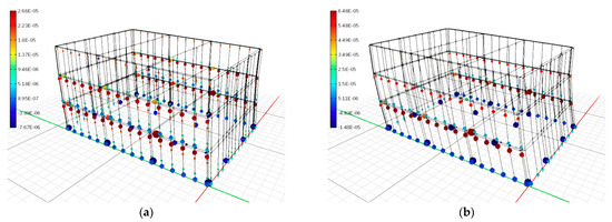Concerning the pushover in Y direction, Figure 14a depicts the curvature of the different sections for a top node displacement of about 100 mm: it is possible to observe that the plastic hinges occur at the bottom and top sections in the reinforcing columns at the first and second floor while, in the existing frame, the hinges are again at the base of the columns and on the flat beams. Figure 14b shows the curvature corresponding to the attainment of LS chord rotation capacity of the columns of the existing building. It is interesting to note that no shear failure was detected on the existing flat beams, as opposed to the pushover in Y direction of the existing building without reinforcement (see Section 4.2.2).