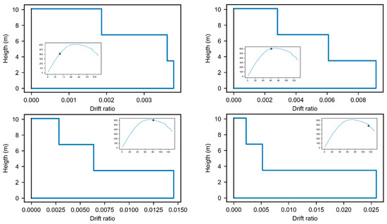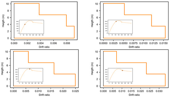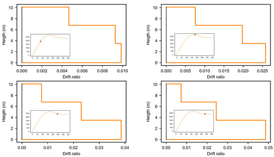 Retrofitted building. Uniform pushover analysis in X direction: evolution of the inter-story drift distributions.