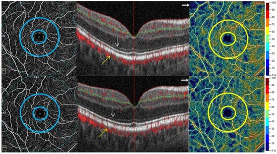Optical coherence tomography angiography (OCTA) and capillary perfusion density analysis. Legend: Top row: Left, example of en face OCTA of rheumatoid arthritis patient. The foveal area is identified by a circle 1 mm in diameter centered on the fovea, the parafoveal region is included between the two concentric circles of 1 mm diameter and 3 mm diameter; center, structural optical coherence tomography, showing the complete integrity of the layers and flow signals; right, full retina capillary vessel density analysis. Bottom row: No changes in the retinal architecture and vessel density at one-year follow-up can be seen, compared with baseline images; in particular, the integrity of the retinal inner and outer segments (white arrow) and retinal pigment epithelium (yellow arrow) are well represented; in parallel, no significant change in the vessel density may be observed within 1 and 3 mm circles.