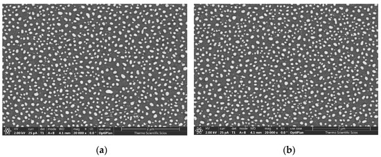 The obtained samples were investigated with a SHIMADZU UV-3600 (Kioto, Japan, Shimadzu Corporation) spectrophotometer to study their plasmon wavelength. The optical transmittance of the samples was measured in the air before and after the adsorption of the analytes. The freshly prepared and washed metallic nanoislands were examined by using a scanning electron microscope (SEM). SEM images were recorded with a Hitachi S4300-CFE (Chiyoda City, Tokyo, Hitachi Corporation) instrument (see Figure 1).