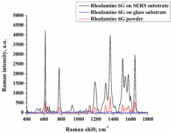 The same comparison for the other analyte, i.e., R6G, is provided in Figure 5. The characteristic peaks of R6G can be detected for both excitations. In terms of the enhancement, it is better with 532 nm excitation; the EF for R6G is 110 for the 532 nm excitation and only 14 for 633 nm.