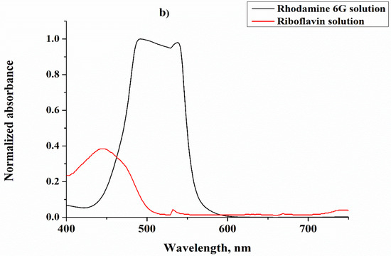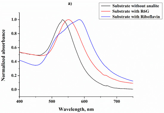 In the case of gold nanoisland substrates, a higher enhancement would be expected for 532 nm excitation, since the magnitude of the SERS enhancement is influenced by the plasmon wavelength of the substrate. We know that the LSPR peak of the active surface must fall close to the wavelength of the excitation source [12]. This is true in the case of rhodamine 6G, where a higher enhancement was observed with the green laser, but the opposite occurs for riboflavin. This may be explained by the fact that the adsorption process of riboflavin is different as compared with R6G, which results in a greater plasmon wavelength of the gold substrate. As a result, the LSPR peak will be closer to the wavelength of the red laser and a greater enhancement can be achieved with this excitation source. Figure 6a shows the normalized absorbance of the gold nanoisland substrate without analyte and with R6G and riboflavin adsorbed on the surface. It can be seen how the plasmon wavelength of the gold substrate is redshifted by the different analytes. Initially, the LSPR wavelength of the clean substrate is at 532 nm, which is shifted to 551 nm with rhodamine 6G, and to 585 nm with riboflavin. The latter is closer to the wavelength of the 633 nm excitation source than to 532 nm. Furthermore, Figure 6b shows the spectra of the normalized absorbance of the two analyte solutions. In the 400–750 nm region, the absorption peak of riboflavin is located below 510 nm, while R6G has strong band in the 425–600 nm region. Comparing this with the excitation wavelengths, it can be concluded that a resonant Raman scattering could occur mainly for the R6G and for that only with 532 nm excitation. As a consequence, the SERS spectrum of this analyte can also be of resonant with 532 nm excitation.