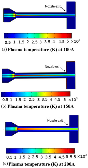Distribution of plasma temperature for different current values ((a) 100 A, (b) 150 A, (c) 200 A) in the torch.