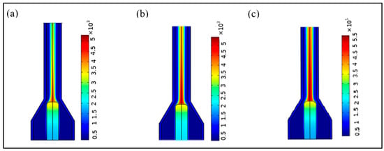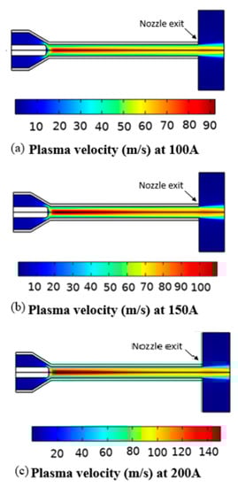 Distribution of plasma velocity for different current values ((a) 100 A, (b) 150 A, (c) 200 A) in the torch.