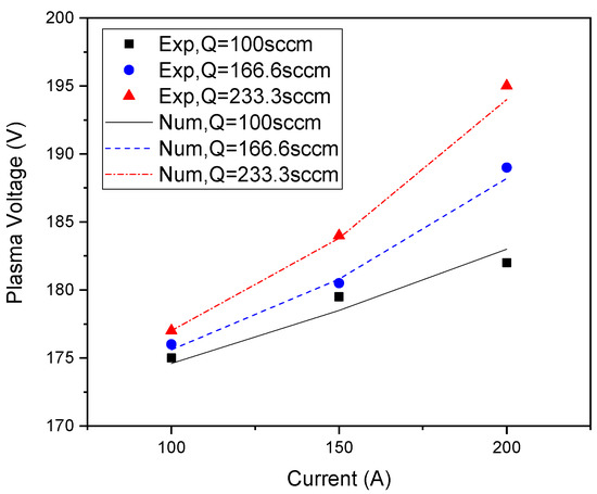 Figure 7 illustrates the numerical results and experimental measurements of electrothermal efficiency of the plasma torch for different working currents and at different mass flow rates. At lower mass flow rates, the increase in current led to an increase in the degree of ionization, which increased the plasma pressure inside the torch; then, the plasma velocity increased, and more plasma came out from the nozzle exit of the torch. Thus, the efficiency increased with current. However, at a higher gas flow rate, the amount of plasma coming out from the torch did not increase significantly because the increase in the plasma pressure inside the torch due to the increase in the current caused a higher collision of the plasma particles with the anode wall (limitation of the velocity) and led to more heat loss from the plasma to the walls, decreasing the total efficiency of the torch [36].