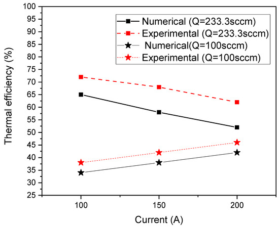 Numerical and experimental variation of thermal efficiency with working current (100 A, 150 A, 200 A) for different gas flow rates (Q = 233.3 sccm and Q = 100 sccm).