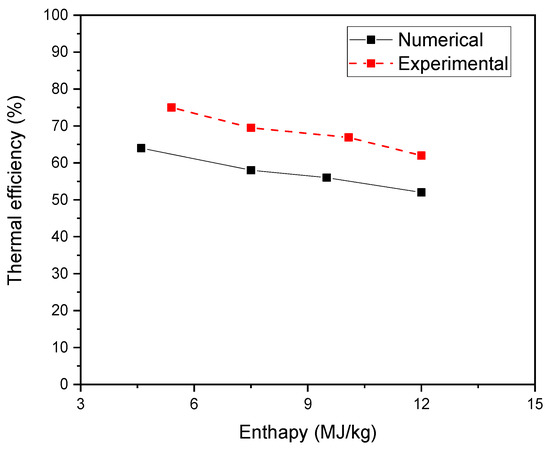 Numerical and experimental variation in thermal efficiency as a function of enthalpy with a gas flow rate Q = 233.3 sccm.