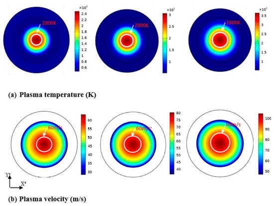 Another effect of current on the plasma characteristics, at the torch exit, can be intuitively shown in Figure 10. As the current increased from 100 to 200 A, the plasma temperature and velocity distributions were plotted in the ranges of 0–4000 K and 0–150 m/s scales, respectively. Figure 10a exhibits that the area of the high temperature (>2800 K) was progressively increased. Simultaneously, as shown in Figure 10b, the plasma velocity had the same variation tendency. This occurrence suggests that the increment in working current forced the plasma jet to exit the nozzle torch with a faster and larger hot core diameter.