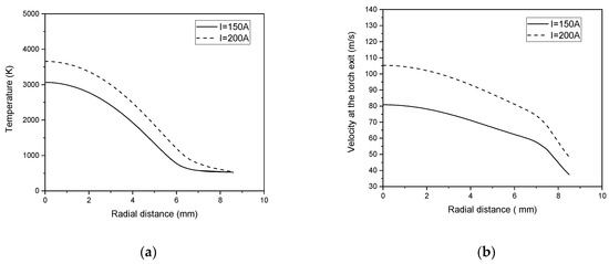 Figure 11 represents the radial profiles of the temperature and velocity plasma jet at the torch exit for different values of working current. The increase in current had a greater effect on the plasma velocity (Figure 11a) compared to the temperature. Indeed, the maximum temperature had only risen by about 600 K when the current varied from 100 A to 200 A (Figure 11b). This was due to the dissipation of electrical energy by the cooling water. This effect can be confirmed by the decrease in the thermal efficiency versus current, presented in Figure 7.