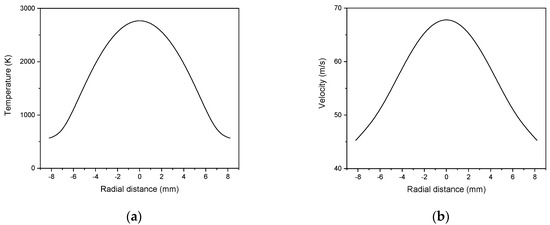 The radial profiles of the temperature (a) and velocity (b) plasma jet at 80 mm from the nozzle torch exit.