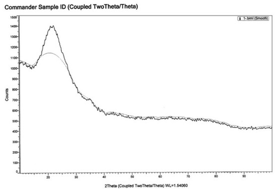 X-ray diffraction is an interesting technique to identify the purity, size, and crystalline nature of the materials. Figure 14 depicts the X-ray diffraction patterns of the silica sample. This figure contains, around the angle 2 theta 22–23, a strong broad, which is the characteristic of silica. This result confirms that the state of the synthesized nanosilica was amorphous. The Scherrer formula and the full width at half maximum (FWHM) were used to determine the average particle size of the silica samples. The average size of nanoparticles was calculated using the following formula:
