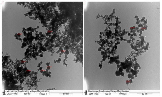 The Debye–Scherrer formula was obtained from a model in which the size distribution of the crystallites was ignored; hence, the average grain size obtained from this formula was not precise compared to the size of the nanoparticles measured by TEM. Different images at variable magnifications (50,000–60,000) were recorded for the sample to investigate its average grain size. The recorded TEM images of nanosilica are shown in Figure 15. These images show that the morphology of the nanoparticles had a nearly spherical shape with a diameter ranging from 10 to 20 nm. These results confirm that the average particle dimension of the obtained silica was in nanoscale size and that they are in accordance with the XRD results.