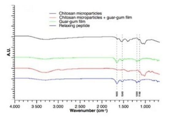 FTIR analysis is proposed to investigate the interaction between substances. In this study relaxing peptide, peptide-loaded chitosan microparticles, peptide-loaded guar-gum films, and peptide-loaded chitosan microparticles into guar-gum films were analyzed through the FTIR spectra to understand the chemical structure stability (Figure 1). The characteristic band of the relaxing peptide could be seen in the fingerprint region between 1100 cm−1 and 1250 cm−1 (C-C-O and C-OH bonds), 1490 cm−1 and 1580 cm−1 (amide II band), and 1580 cm−1 and 1740 cm−1 (C=O stretching vibrations and of C-N stretching) [].