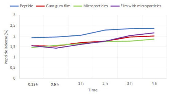The peptide-loaded CH MPs showed an encapsulation efficiency of about 86%. The peptide loading in % w/w in chitosan microparticles was 0.63% and in guar-gum films with chitosan microparticles was 0.18%.