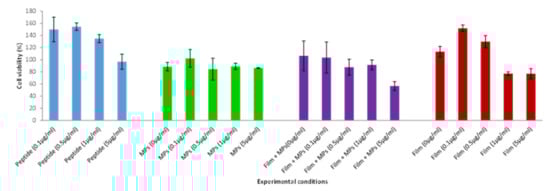 Cell viability of TR146 cell line, after 24 h treatment with chitosan microparticles, guar-gum films, with or without peptide, were measured using the methylthiazolydiphenyl-tetrazolium bromide conversation (MTT) assay [].