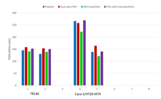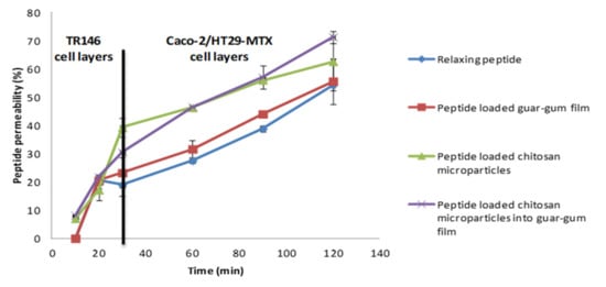 The relaxing peptide permeability coefficient (Papp) was calculated for all samples (Table 2). The apparent permeability of relaxing peptide carried by chitosan microparticles into guar-gum films was significantly higher (p < 0.05) across TR146 cell layers, when compared with remaining formulations and control solution, as outlined in Table 2. The cumulative permeability of relaxing peptide across Caco-2/HT29-MTX was also observed for peptide-loaded chitosan microparticles into guar-gum films. The results showed the uptake of chitosan microparticles by Caco-2 intestinal cells can explain the extensive permeation of the peptide carried by peptide-loaded chitosan microparticles into guar-gum films across Caco-2/HT29-MTX co-culture.