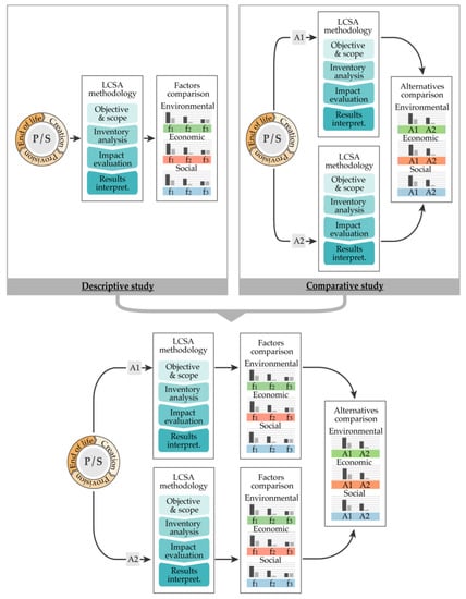 Two types of sustainability studies applied to product or service systems can be distinguished (Figure 1). The first type, a descriptive study, focuses on evaluating a system and identifying the different factors (f1, f2, f3, …) affecting the indicators of each sustainability dimension. Results interpretation in this type of study can be used to achieve sustainability improvements [53]. The second type, a comparative study, evaluates the sustainability of two or more scenarios or alternatives (A1, A2, …). This type of study focuses on comparing impacts in each sustainability dimension (environmental, economic, and social) and determining the most sustainable alternative. Many studies have applied the LCSA to evaluate the sustainability of product systems [54].