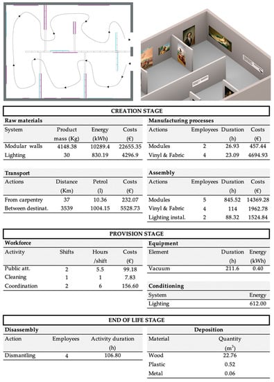 Two alternatives were analysed. In the first alternative, the cultural content of the exhibition will be exposed to hard copies (print on fabric and vinyls). In the second alternative, these contents will be projected onto the exhibition hall walls using audiovisual media. In both alternatives, a rectangular exhibition area of 300 m2 (20 m × 15 m) and 4 m high is required. The entire life cycle was also reviewed. Thus, in each alternative, the activities necessary to transform an empty hall into a suitable exhibition space are analysed in the creation stage, as is the service development during the provision stage and the dismantling and management of all used materials in the end-of-life stage after the exhibition is finished in the last destination. The design of the printed support and audiovisual content was not included in the scope of this research.