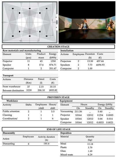 In this alternative, the exhibition of cultural content is based on the use of audiovisual media. Contents are projected onto the four walls by ten projectors (plus one spare), and audio tracks are emitted by eight speakers. This equipment is conveniently distributed and installed by two workers on the technical ceiling (floor plan and showroom perspective; Figure 3). In addition, a computer to control audiovisual material is required. The device’s raw materials and manufacturing data, transport from the warehouse to the exhibition hall (37 km), transport between destinations (3539 km), and installation activities in the showroom are examined in the creation stage.