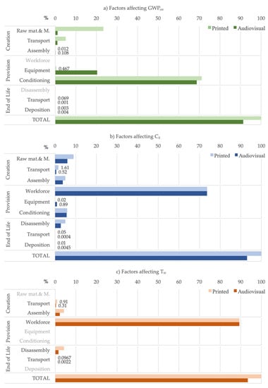 A significant increase in greenhouse emissions was observed in the audiovisual alternative during the provision stage. An increase of 8.9 tons of CO2-eq was evaluated in the GWP100 indicator. Although the incidence of conditioning is higher in printed exhibitions because it requires appropriate lighting (content oriented), in contrast with the audiovisual alternative where a dark room is necessary, the energy consumption by equipment is considerably higher in the audiovisual exhibition. In addition, energy consumption affects the CE indicator. An increase of EUR 2200 is calculated. Nevertheless, execution costs in the provision stage depend mainly on the workforce factor, and this factor is not modified much in the two projected exhibition alternatives.