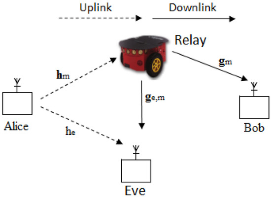 Unlike [1,2,3,4,5], which illustrate a four-terminal relay-eavesdropper network, there is no direct link between the source (Alice) and legitimate destination (Bob) in our system model due to the long distance between them and limited transmit power at Alice; therefore, the channel model and subsequent signal analysis are quite different from those in [1,2,3,4,5]. Moreover, in contrast to [2,3,4] with the relay’s location variation restricted in a line, the relay in our scheme moves around in a two-dimensional (2D) space, which is more complicated. In particular, unlike [3], where the relay assists the wire tapper rather than the destination, the mobile relay in our scheme helps the destination and suppresses the eavesdropper.