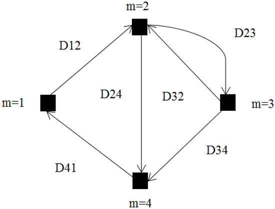The two-way wireless secure transmission mobile relay system shown in Figure 1 was considered, and it consists of two IoT users (Alice and Bob), an eavesdropper (Eve), and a relay. The relay is equipped with N antennas and mounted on a ground mobile vehicle. Alice, Bob, and Eve are configured with a single antenna. Alice and Bob exchange data through the mobile relay under the condition of Eve eavesdropping the whole process. The scenario is described as a directed graph as shown in Figure 2, where is the set of M vertices representing the possible stopping points, and is the set of directed edges representing the allowed movement paths [14,15]. We let , be an asymmetric non-negative real distance matrix associated with , and we assume that the following three conditions hold: