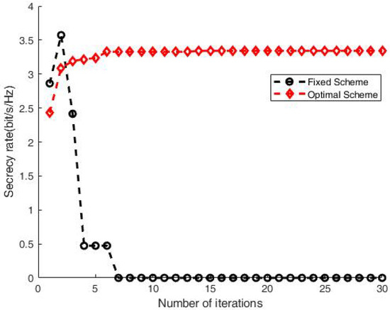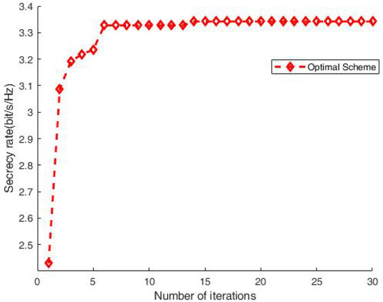 To verify the convergence of Algorithm 2 in the previous section, Figure 3 shows the relationship between the secrecy rate and the number of iterations. It can be seen that with , a stable result is obtained. This verifies the convergence of our proposed algorithm with a moderate number of iterations.