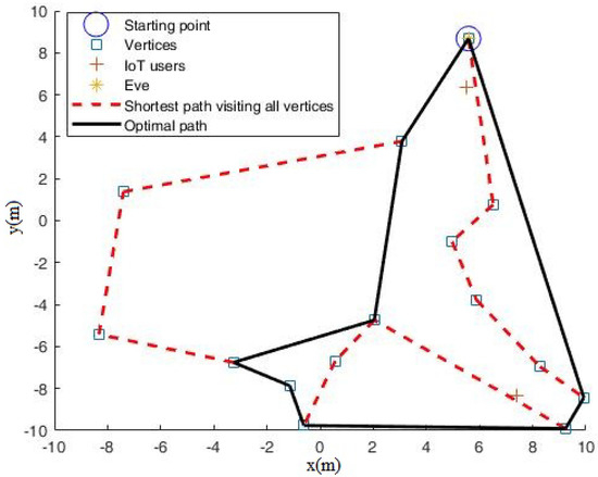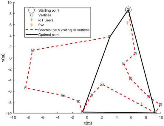 Based on the above settings, we simulate the secrecy rate map in a 20 m × 20 m = 400 m square area [14,27], which is a typical size of a smart warehouse. Inside this map, 2 IoT users, 1 eavesdropper, 1 relay with 8 () antennas, and vertices representing stopping points are randomly scattered, with the eavesdropper being near to the starting point of the relay.