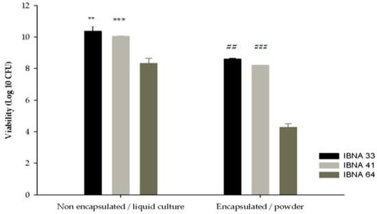 In the case of L. acidophilus IBNA 64, known as a thermo-sensitive probiotic strain, the viability was significantly different compared with the liquid form, where the survival was around 5% (remaining viable ~2 × 104 CFU g−1). Instead, the impact of the spray drying on L. salivarius powders generated a 2 Log ten-fold lowest viability as follows: IBNA 33 resisted around 80% (remaining viable ~4 × 108 CFU g−1), with 78% for IBNA 41 (remaining viable ~1.6 × 108 CFU g−1) vs. bacterial non-encapsulated culture.