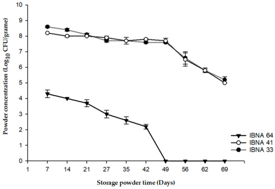 A 3 Log CFU g−1 reduction of viability was reached after 2 months of storage, when strains resisted around 65%. In contrast, after spray drying, the viability of L. acidophilus IBNA 64 was reduced gradually after 7 days of storage at room temperature. Moreover, after 30 days, L. acidophilus IBNA 64 completely lost viability. We can affirm that the drying process displayed a decrease in viability, reaching a resistance around 87% for IBNA 33, 95% for IBNA 41, and 3% for IBNA 64 at 35 days of powder storage. These results showed that spray drying decreased the stability of Lactobacillus powders during the entire period of storage. Comparatively, with L. acidophilus IBNA 64 where a larger loss of viability was noted, the L. salivarius (IBNA 33 and IBNA 41) involved better stability. We can conclude that powders of L. salivarius (IBNA 33 and IBNA 41) were more stable than L. acidophilus IBNA 64.