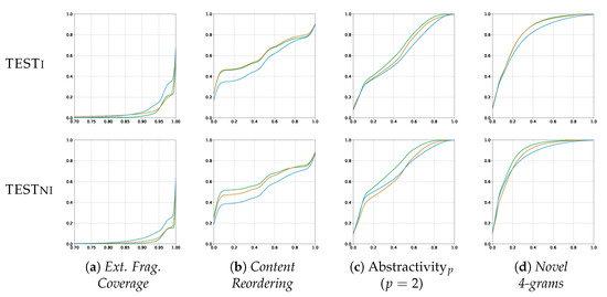 With the aim of better analyzing the behavior of the models, we computed the cumulative distributions of the abstractivity indicators for each model and test partition. The results are presented in the Figure 1.