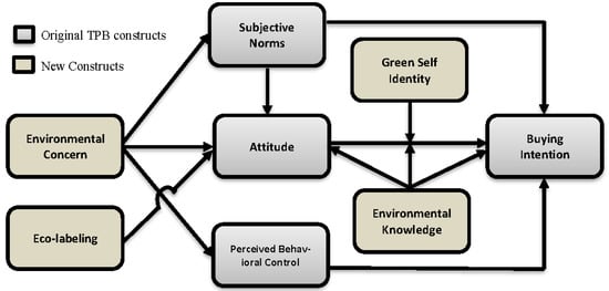The study adopted the theory of planned behavior as the underpinning theory and also added some context-wise factors (environmental concern, environmental knowledge, eco-labeling, and green self-identity) based on the massive literature review (Table 1) in the proposed model to fulfill objectives, as can be seen in Figure 1.