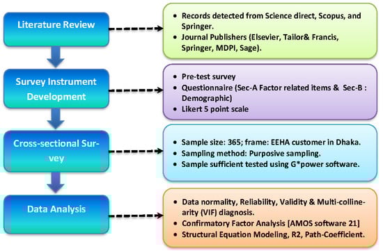 This is exploratory research based on empirical data (Figure 2). The study utilized original data from a survey of customers to ascertain the factors impacting their green purchasing decisions. It employed a cross-sectional survey design, implying that data was gathered to evaluate the inference of the population at a particular point in time.