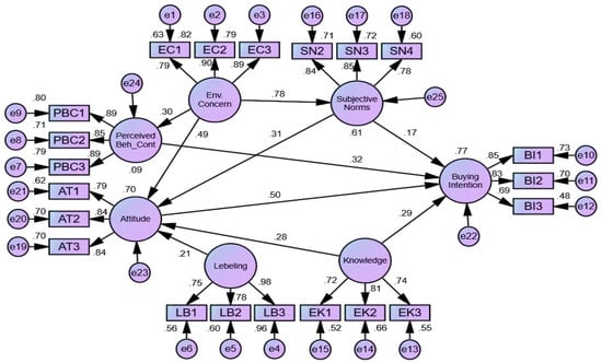 In previous studies [46,47], environmental knowledge was considered as one of the most direct indicators of environmental behavior. However, much research has highlighted a minimal direct association between environmental knowledge and environmental performance [48]. According to Kollmuss and Agyeman [49], the direct relationship existent between green awareness and PEB is still unknown. Since a contradictory result exists in the past literature, there is a need to retest the variable for validation from a developing country’s perspective. Likewise, Kim et al. [50] observed a coherent SN-Attitude relationship but not with the BI, while Anssi Tarkiainen Sanna Sundqvist [51] observed a relationship with intention but not with Attitude. However, there is still an unexplored question of whether subjective norms simultaneously affect attitude and buying intention or not.