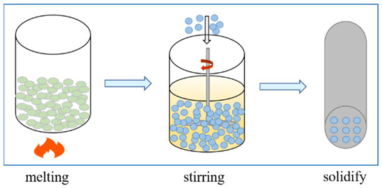 In particular, it has been pointed out that organic solid–liquid PCMs have great practical application value, and can be used in building air conditioning, underground heating and refrigeration systems [5,6]. However, the thermal conductivity of organic solid–liquid PCMs is low and needs to be increased by adding thermal conductive particles. In the preparation processes of PCM mixture, the key is to ensure a degree of homogeneity throughout the vessel, prevent solid accumulation and maximize the contact area between solid and liquid phases [7,8,9]. Thus, most of the methods for the mixing of thermal conductive particles and PCMs needs high efficiency stirring. For example, the melt blending method, one of the most favorable manufacturing methods for solid–liquid PCMs due to its potential in large-scale production, is to directly add the thermally conductive filler to the molten polymer, mix it evenly in the stirred tank, and then solidify it to form the product (Figure 1). The mixing quality in the stirring process is directly related to the performance of solid–liquid PCMs, which affects the energy utilization efficiency. At present, various small batches production of solid–liquid PCMs have been widely adopted, however, large-scale production is still in its infancy. The most important reason is the lack of manufacturing technology and equipment suitable for mass production. Therefore, a study of stirring equipment for mixing with high efficiency, rapidity, and homogeneity is important, and can also be helpful for solid–liquid mixing in other fields.