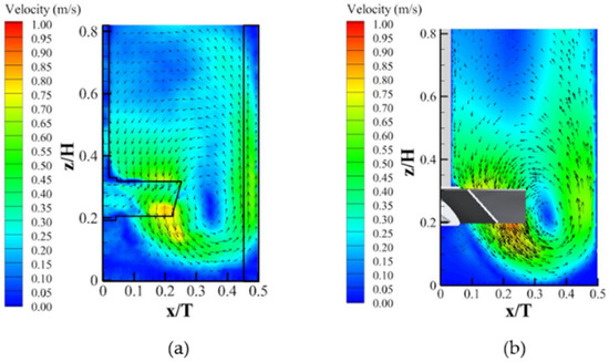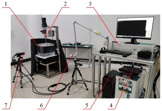 The tracer particles used in this experiment were hollow glass particles with a diameter of 10 to 20 μm and a density of 1030 kg·m−3, which was quite close to the liquid density, so as to better track the liquid velocity. The selected interrogation area was 64 × 64 pixels, and the overlap area was 50% during the correlation. Considering the accuracy of the experimental data and the efficiency of the image processing, 500 pairs of collected images were processed to obtain the time-average flow field in each condition.