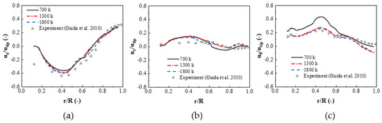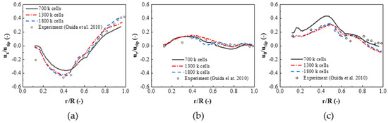After the qualitative verification of the EE-KTGF model, the simulation results for the axial, radial and tangential velocities at z = 0.2H obtained using computational grids with 700, 1300 and 1800 k cells were compared with the experimental data from Guida et al. [25] to ensure grid independency and reliable results in high solid loading systems. The impeller speed was 405 rpm and the solid volume fraction was 5.2%. Figure 6 and Figure 7 display three velocity components of both the liquid and solids with different mesh cells. The velocity components were normalized by the impeller tip speed, utip. It is evident that the results with different cells have the same variation trend, but the 700 k cells had a large deviation compared with experimental data. A further-refined mesh was required to acquire accurate results. The normalized velocity components obtained using numerical simulation with 1300 k cells and 1800 k cells were in good agreement with the experimental results. The average relative error between the CFD and the experimental results was 9.7%, indicating that the simulation method can reasonably predict complex flow in the stirred tank. The relative error for the normalized velocity component between 1300 k cells and 1800 k cells was less than 5%. Therefore, the mesh with 1300 k cells was used for the subsequent simulations to achieve a compromise between accuracy and computational cost.