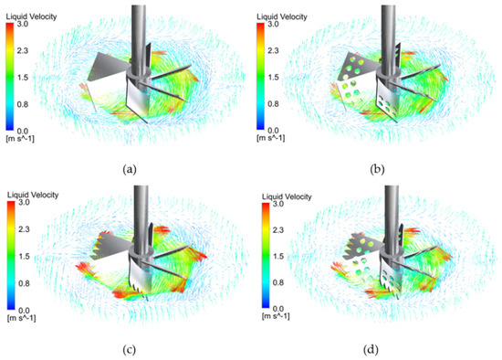 Liquid velocity vectors profile around the different impeller blades. (a) PBT, (b) PBPT, (c) BCBT, (d) BCPBT.