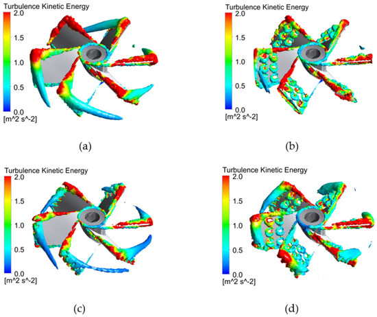Three-dimensional structure of trailing vortex behind different impeller blades colored by turbulence kinetic energy. (a) PBT, (b) PBPT, (c) BCBT, (d) BCPBT.