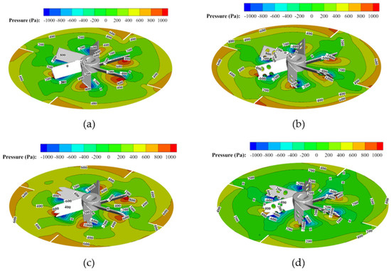 Contour plots of pressure on the center plane of impellers at z = 0.25 H, (a) PBT, (b) PBPT, (c) BCBT, (d) BCPBT.