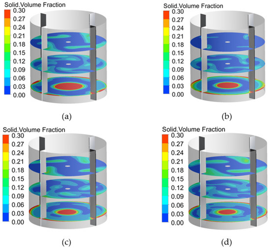Contour plots of the solid volume fraction on horizontal planes at different vessel heights (i.e., z = 0.1H, 0.4H, 0.7H). (a) PBT, (b) PBPT, (c) BCBT, (d) BCPBT.