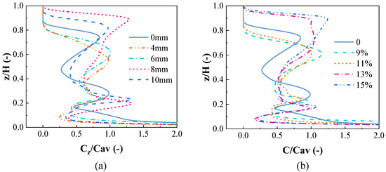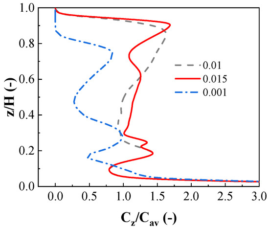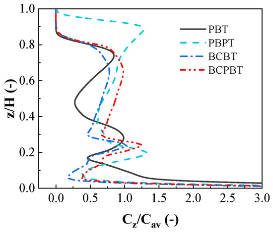 Figure 15 depicts the axial solid concentration profile for different aperture parameters at r/R = 0.5. With the increase of aperture diameter, mixing effects were improved in the axial direction. When the aperture diameter reaches 8 mm, a better mixing performance forms in the tank, where particle deposition decreases significantly at the bottom. As the aperture diameter increases to 10 mm, owing to the fact that the axial pumping effects of impellers are weakened in the vertical direction, it has an adverse impact on particle axial motion. As a result, the solid hold-up is larger, and the deposition is more severe at the bottom of tank. It can be observed from Figure 15b that the Cz/Cav values of the BCPBT were higher than those of the PBT. The distribution of the solid particles of BCPBT was more uniform than that of PBT in the axial direction when the aperture ratio was 13%.