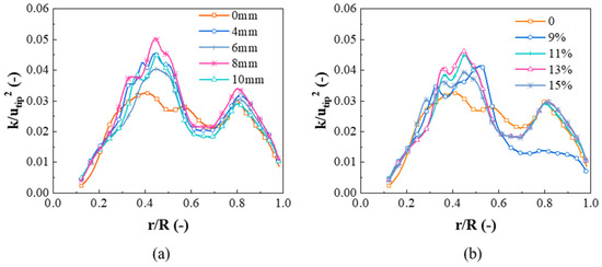 Influence of aperture parameters on local radial turbulence kinetic profiles. (a) Influence of aperture diameter, (b) influence of aperture ratio.