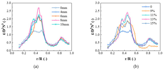 Influence of aperture parameters on local radial turbulent kinetic energy dissipation rate profiles. (a) Influence of aperture diameter, (b) influence of aperture ratio.