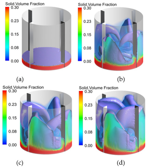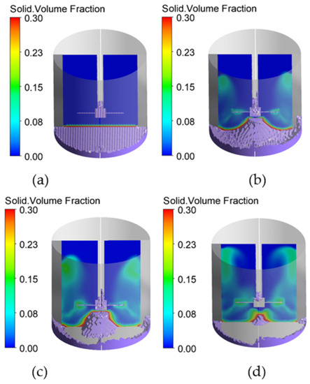 3D solid volume fraction contour plots and cloud height for different impeller speeds. (a) 180 rpm, (b) 300 rpm, (c) 420 rpm, (d) 540 rpm.